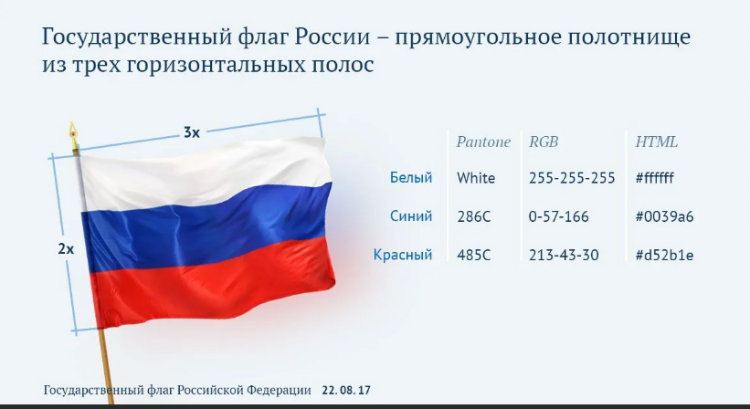 Государственный флаг Российской Федерации представляет собой прямоугольное полотнище из трёх равновеликих горизонтальных полос: верхней — белого, средней — синего и нижней — красного цвета. Отношение длины флага к его ширине 2:3. Его ещё называют Триколор.