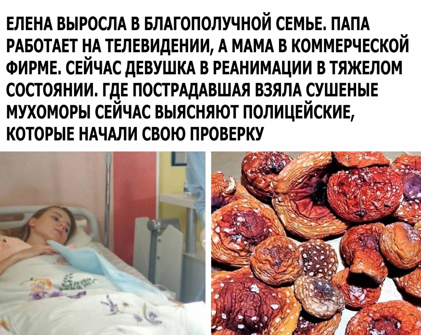 Ей что интересно было попробовать сушеные мухоморы ? Но ее мечта сбылась , теперь будет знать , жива осталась и слава богу .
