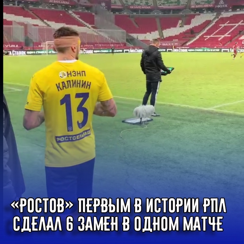 В матче Российской Премьер-Лиги между казанским «Рубином» и «Ростовом» гостям пришлось сделать шестую замену в матче. Согласно регламенту проведения соревнований, если у игрока черепно-мозговая травма, то разрешено сделать дополнительную замену. Именно такую травму получил защитник "желто-синих" Игорь Калинин.