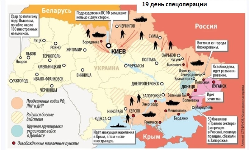 Практически, все крупные города востока и центра Украины блокированы. Но во многие города российские войска не входят, предоставляя власти и мирным жителям право самостоятельного выбора своей судьбы.