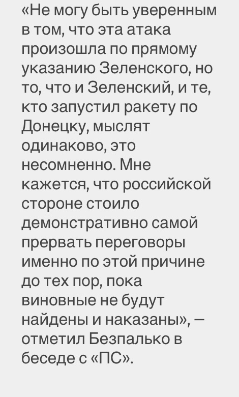 У украинских переговорщиков странная позиция: перед 1-й встречей Давит Арахилия выставил в Социальной сети картинку с «русским кораблем». Перед этой Дмитрий Кулеба, в интервью призвал к физическому уничтожению президента России. Теперь во время переговоров ВСУ бьет по жилым кварталам « Точкой -У» с кассетным зарядом. Они точно переговоров хотят? Они ведут себя как тррористы
