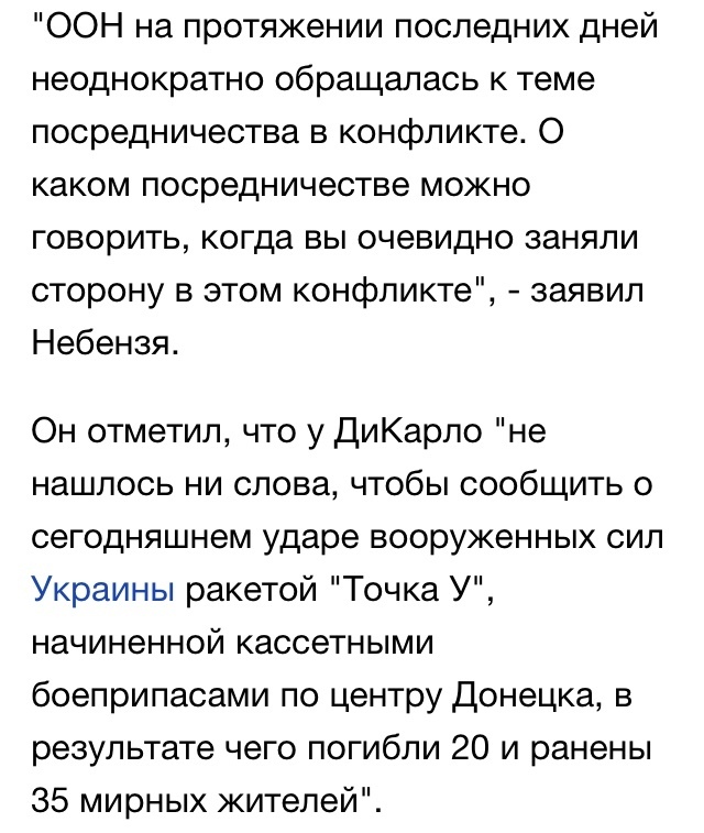 А что же совет ОБСЕ ? Как всегда в таких случаях проявил исключительную слепоту и глухоту. Небензя отметил, что замгенсека ООН даже не упомянула обстрел Донецка «точкой-У»