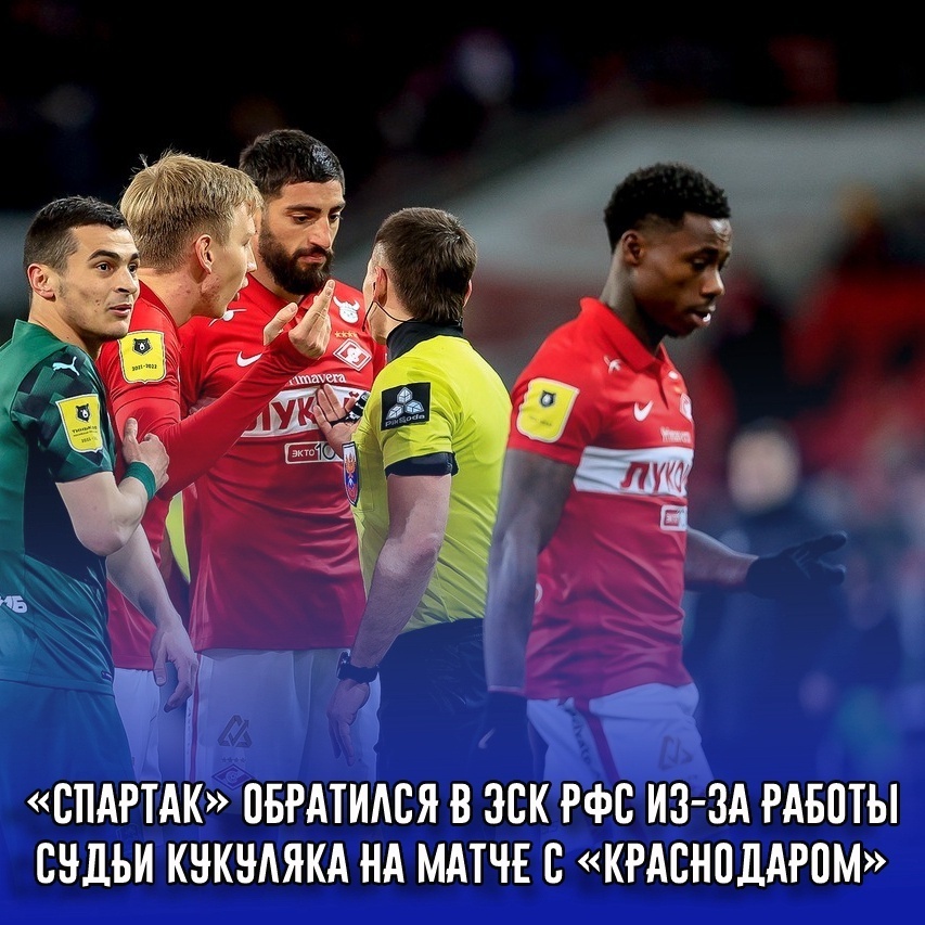 «Спартак» просит оценить работу главного судьи Евгения Кукуляка на матче с «Краснодаром».
