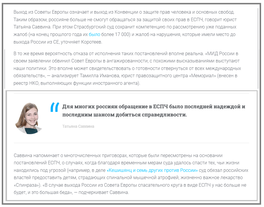 "Боюсь, что в случае выхода РФ из Совета Европы имплементированные в российское законодательство положения Конвенции постепенно девальвируются" - Мария Филатова, доцент факультета права НИУ ВШЭ.