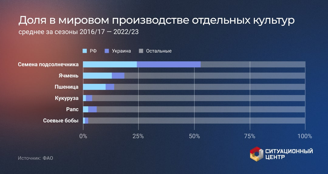 6. Энергетические риски. Сельское хозяйство потребляет большое количество энергии как напрямую, так и косвенно за счет использования удобрений. Рост цен на энергоносители, возникший в результате конфликта, приведет и росту стоимости продукции сельского хозяйства. Кроме того, ряд сельхозкультур, использующихся для биотоплива могут дорожать как альтернативы традиционным видам топлива.