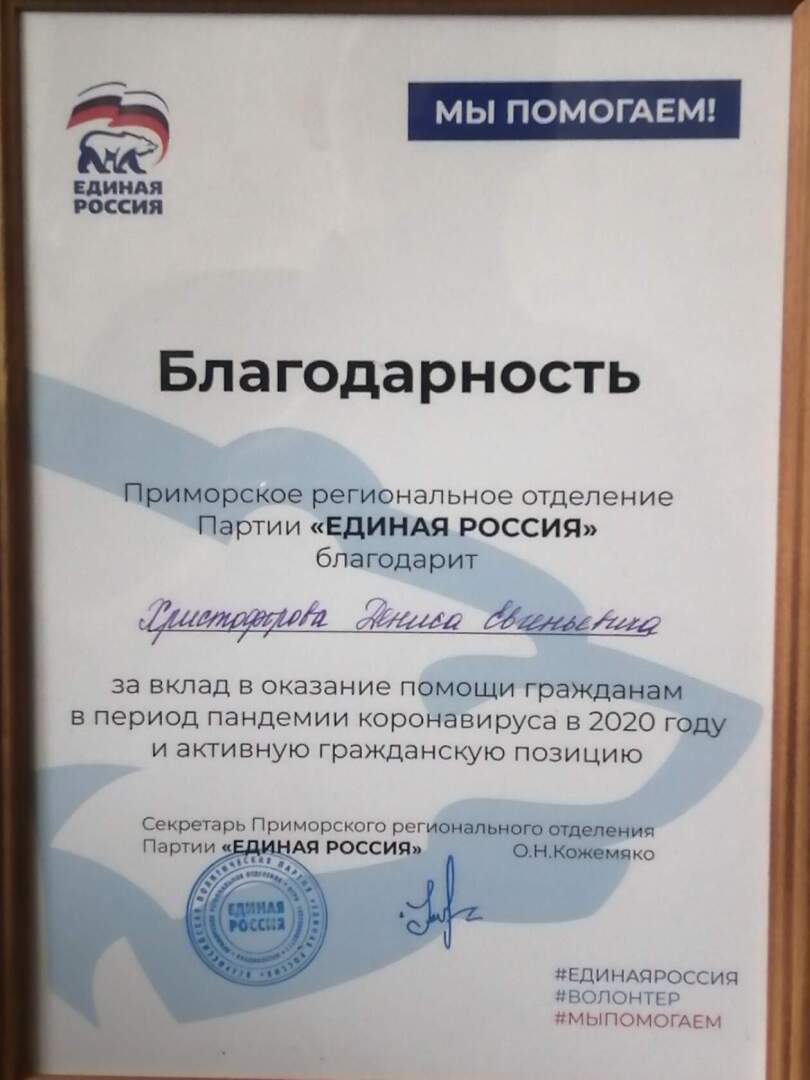Благодарность от губернатора за вклад в оказании помощи гражданам в период пандемии короновируса в 2020 году и активную гражданскую позицию