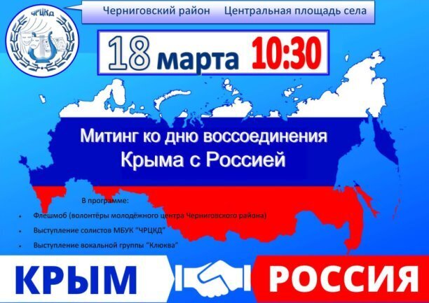 В пятницу, 18 марта, в Черниговском районе, как и в Приморье со всей страной отметят восьмую годовщину воссоединения Крыма с Россией.