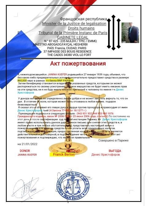 Акт пожертвования французских денежных средств за наследство моего коллеги юриста из Французской республики