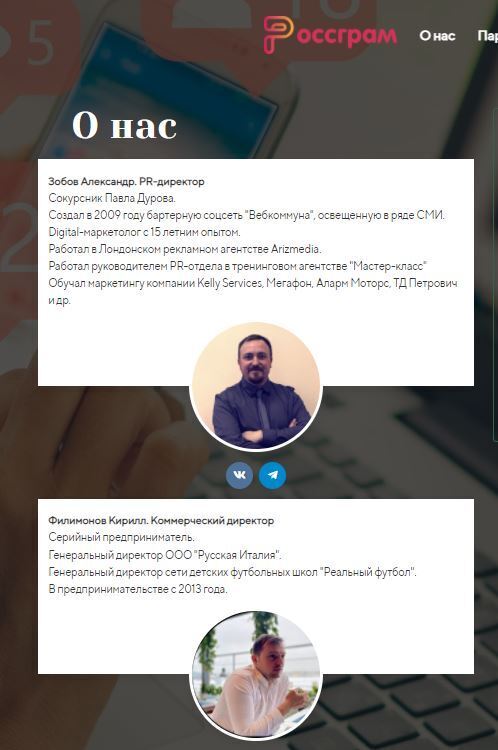 Организаторами сего чудесного проекта являются "серийный предприниматель" Филимонов Кирилл и Александр Зобов. Согласно информации, представленной в разделе "О нас" на странице Россграма, главным своим достижением Зобов считает то, что является сокурсником Павла Дурова (основателя Вконтакте и Телеграмм). Видимо это та самая фишечка, которая должна обеспечить неслыханную популярность его проекту под названием " Россграм".