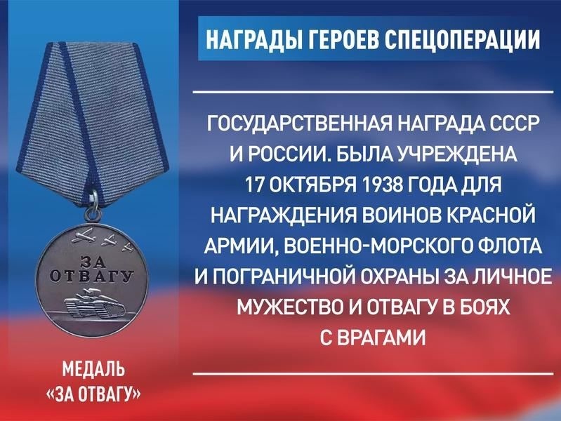 Награды героям — Медаль "За отвагу" — государственная награда СССР для персонального награждения за личное мужество и отвагу, проявленные при защите Отечества и исполнении воинского долга.