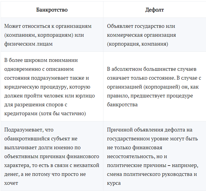 Дефолт, по своей сути очень похож на банкротство. Есть некоторые нюансы отличия.