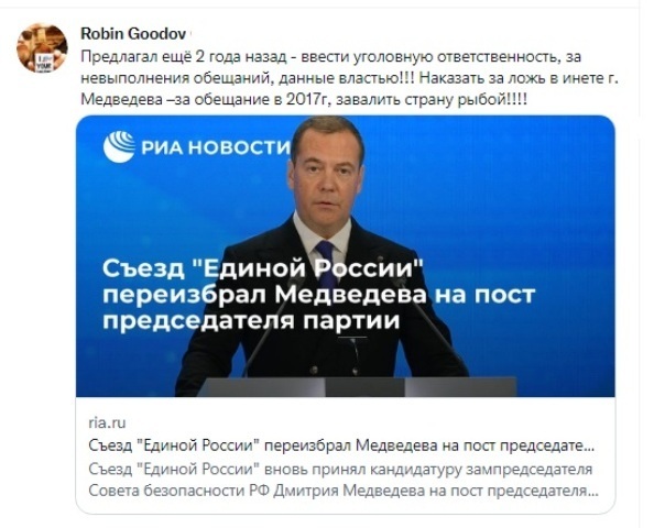 Я уже не раз предлагал - наказать Медведева за невыпоненные обещания в 2017г завалить страну рыбой!!!