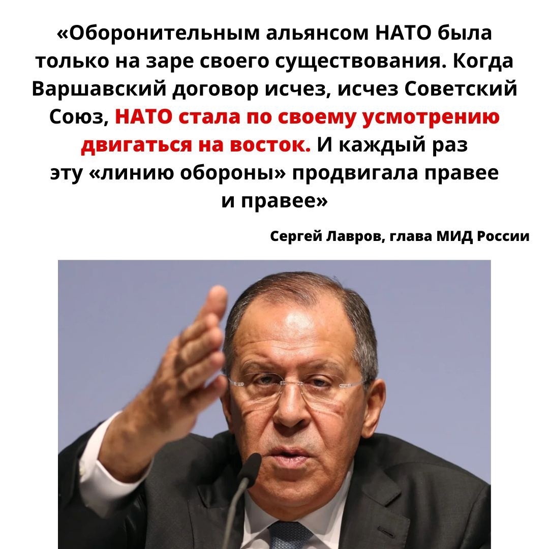 "Оборонительным альянсом Организации Североатлантического договора была только на заре своего существования. Когда Варшавский договор исчез, исчез Советский Союз, Организация Североатлантического договора стала по своему усмотрению двигаться на восток. И каждый раз эту "линию обороны" продвигала правее и правее" - сказал Сергей Лавров, глава Министерство иностранных дел Российский Федерации.