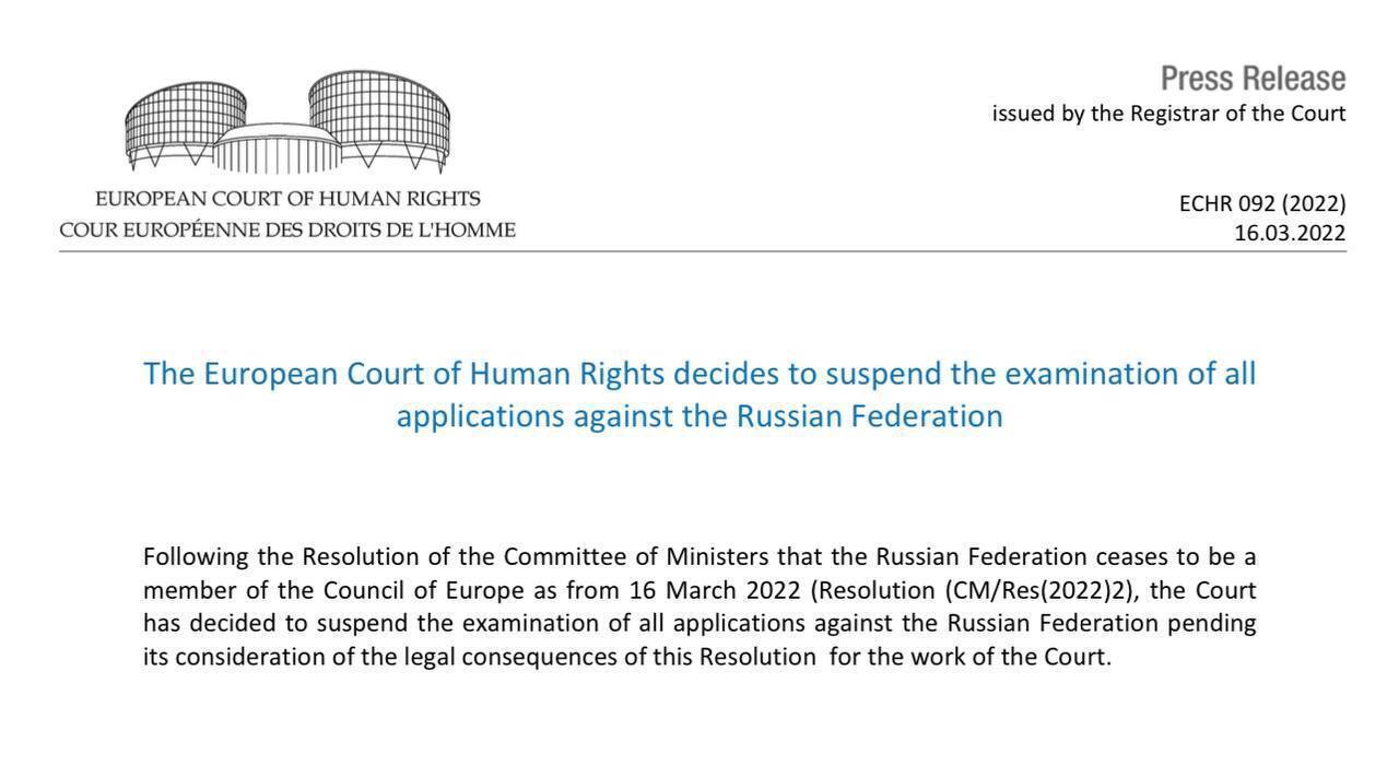 ЕСПЧ решил приостановить рассмотрение всех жалоб против РФ.