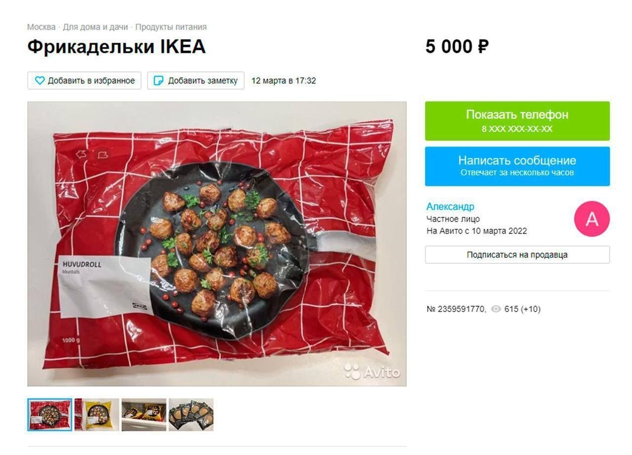 Россияне начали продавать на Авито замороженные фрикадельки, сырники, сосиски, жареные лук и горчицу из ИКЕА. Стоимость лотов варьируется от двух до семидесяти тысяч рублей.