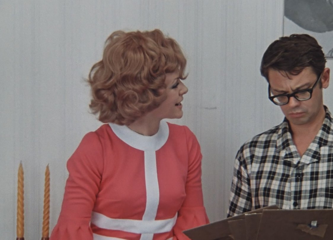 На кадре из фильма "Бриллиантовая рука" фотомодель пытается продать свое платье с перламутровыми пуговицами незнакомцу. 1969 год. СССР.
