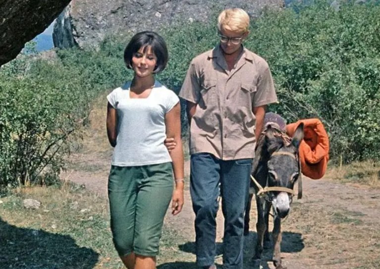 Русская молодая пара со своим ослом гуляет в горах. Они одеты просто, главное в данном случае – удобство. Юг России. 1967 год. Это кадр из фильма "Кавказская пленница".