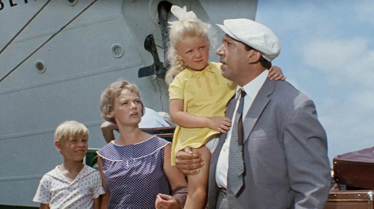 Российская семья ждет международный круизный лайнер, чтобы отправиться за границу. Порт Сочи. СССР. 1969 год. В этой сцене из фильма "Бриллиантовая рука" дети одеты ярко, родители – в традиционные для советского народы рабочего класса, приглушенные цвета.