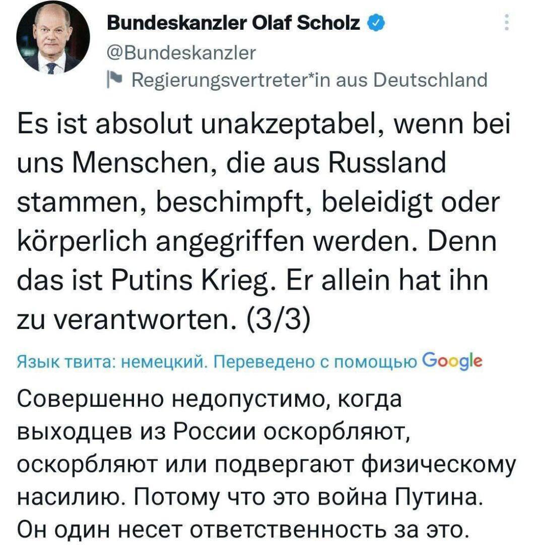 «Абсолютно неприемлемо, когда у нас оскорбляют, ругают или применяют физическое насилие к людям российского происхождения. Потому что это война Путина. Только он несет за нее ответственность», — написал канцлер Германии.