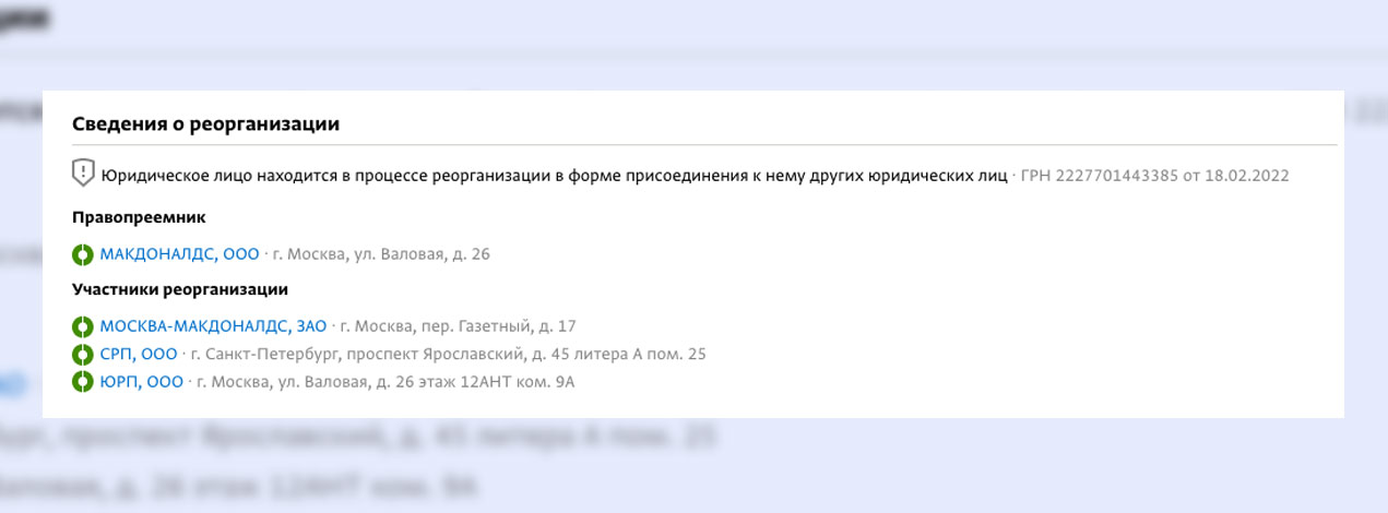 Согласно базе СПАРК, ещё 18 февраля, то есть за неделю до начала российской специальной операции на Украине, все эти компании затеяли масштабную реорганизацию — объединение в одну гигантскую структуру. Спустя три дня гендиректор российского "Макдоналдса" швейцарец Марк Карена ушёл в отставку. Его место занял 45-летний уроженец Ангарска Олег Пароев. Он и проведёт слияние. Почему проводят реорганизацию, почему сменили руководство, есть ли связь с событиями на Украине — официальных комментариев от корпорации нет. Возможно, топ-менеджеры фастфуда на фоне милитаристской истерики, которую устроили американские власти, решили реорганизовать бизнес.