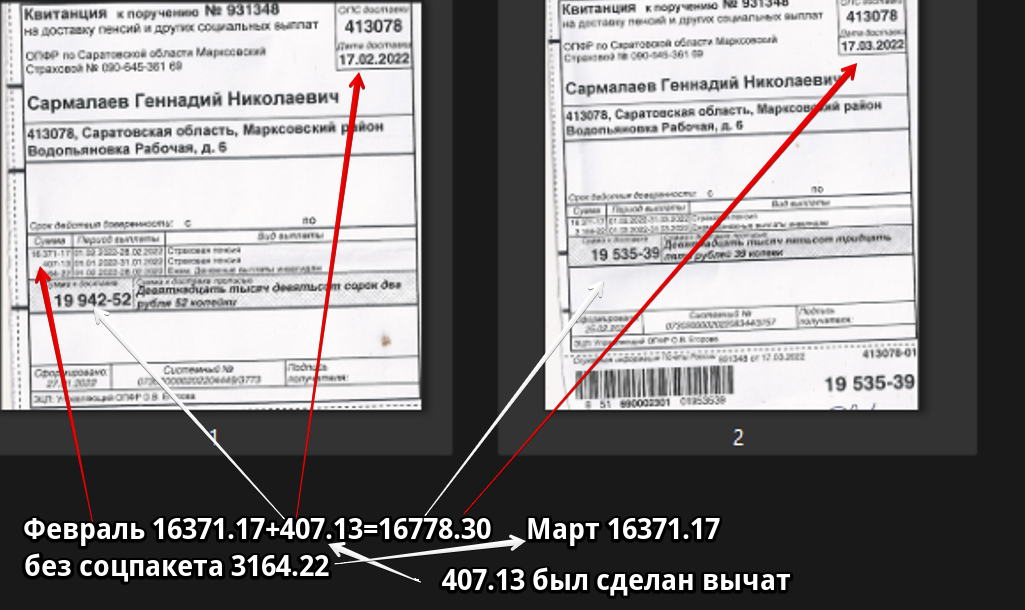Вчера 19.03.22 после обеда принесли мне пенсию. На прошлой неделе мне сказали: что с мартовской пенсии автоматически вычитают часть денег. Так вот, что в итоге: