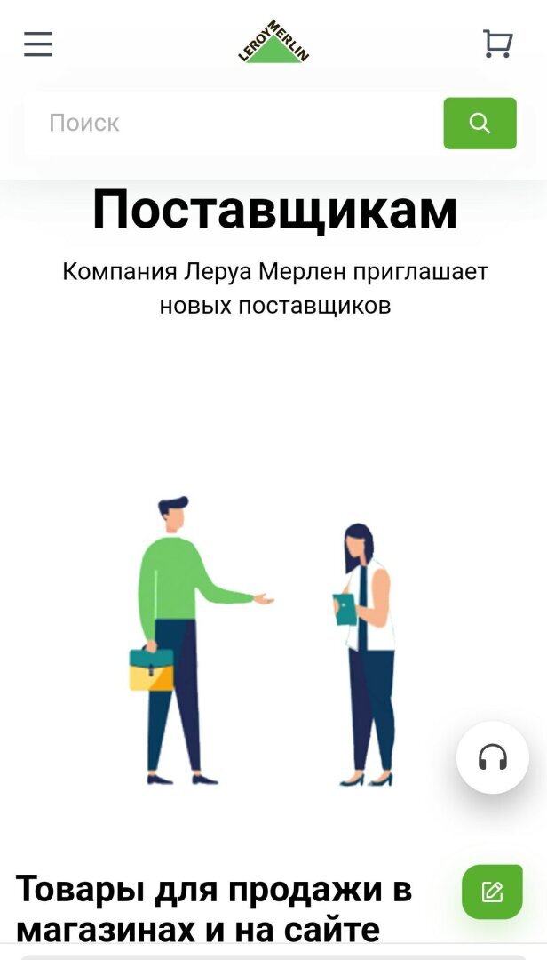 Leroy Merlin приглашает новых российских поставщиков. Это уже не просто отказ от санкций, это сотрудничество с возможностью продавать товары под мировым брендом. Скриншот страницы сайта Leroy Merlin