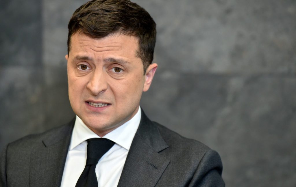 Президент Украины Владимир Зеленский беседует с журналистами в своем кабинете в Киеве 14 июня 2021 года. (Фото Сергея Супинского/AFP через Getty Images)