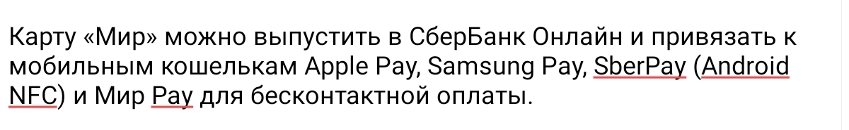 В некоторых зарубежных странах принимаются карты мира. Подробный список стран можно посмотреть на сайте Нацплатформы. Карта Мир может быть выпущена в Сбербанк Онлайн и связана с мобильными кошельками Apple, Samsung, Sberpay Android NFC, и Мир Pay для безконтактного платежа.