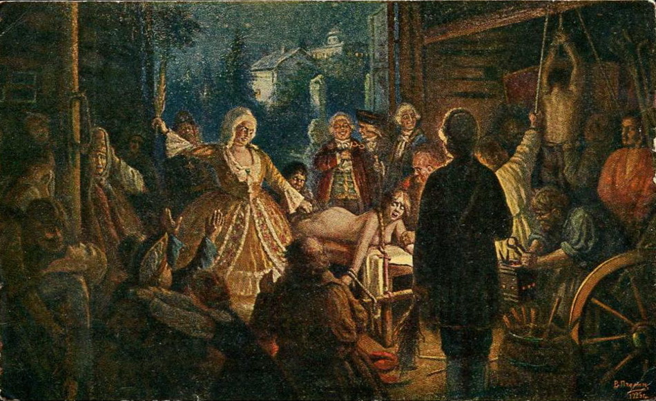 Иллюстрация работы В. Н. Курдюмова к энциклопедическому изданию «Великая реформа», на которой изображены истязания Салтычихи «по возможности в мягких тонах».