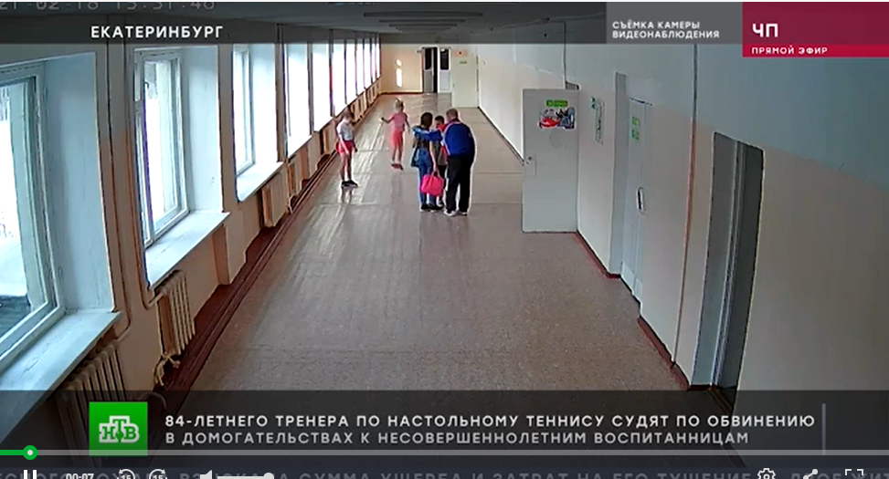 На кадрах с видеонаблюдения в школьном коридоре мы видим, что пожилой тренер подходит к девочки, играющей в коридоре вместе с другими девочками, поддерживая за плечо, что то говорит, затем девочка хочет уйти - тренер ее задерживает (буквально на секунду) и девочка уходит.