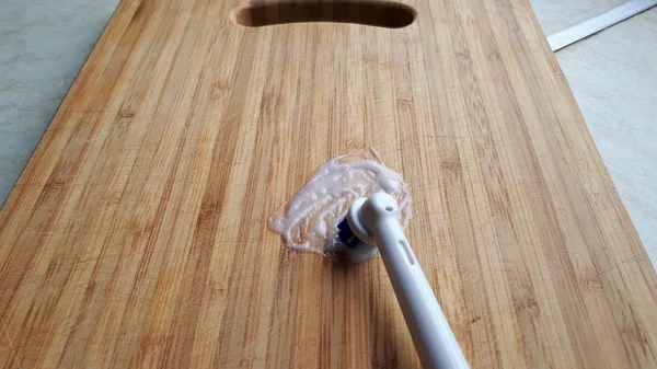 Для процедуры нам понадобится еще один вспомогательный предмет – старая зубная щетка или абразивная губка, с помощью которых мы и будем очищать поверхность доски.