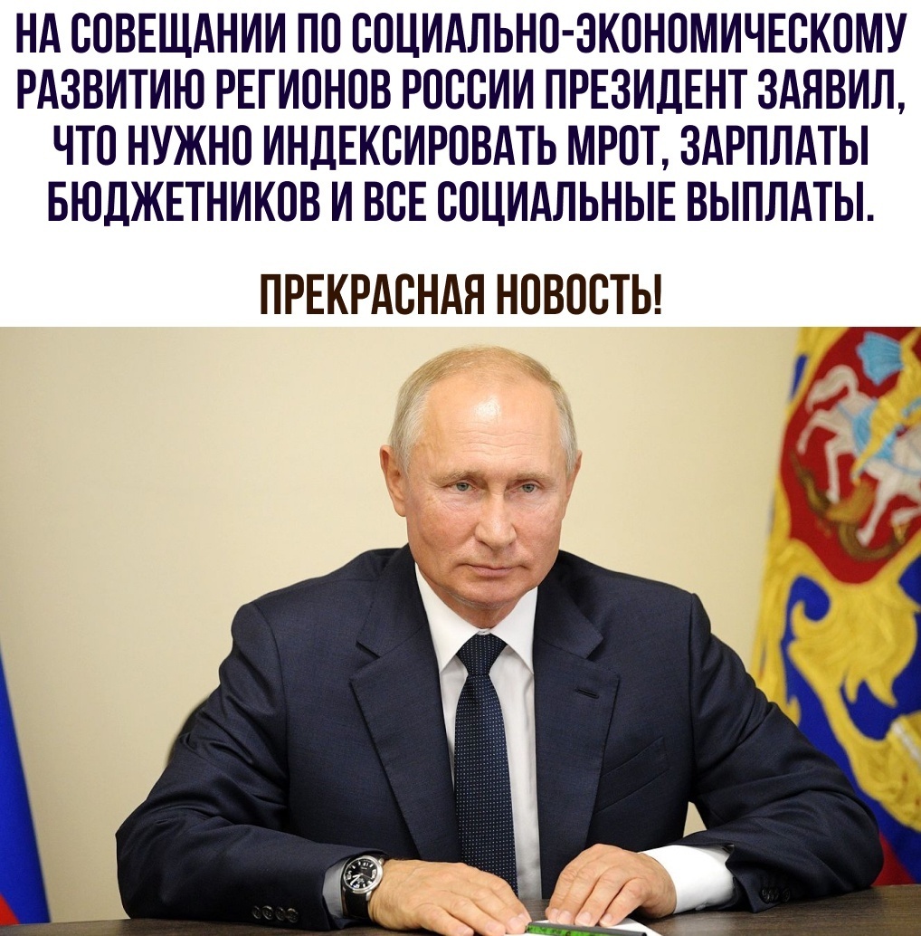 НА СОВЕЩАНИИ ПО СОЦИАЛЬНО-ЭКОНОМИЧЕСКОМУ РАЗВИТИЮ РЕГИОНОВ РОССИИ ПРЕЗИДЕНТ ЗАЯВИЛ, ЧТО НУЖНО ИНДЕКСИРОВАТЬ Минимальный Размер Оплаты Труда, ЗАРПЛАТЫ БЮДЖЕТНИКОВ И ВСЕ СОЦИАЛЬНЫЕ ВЫПЛАТЫ.