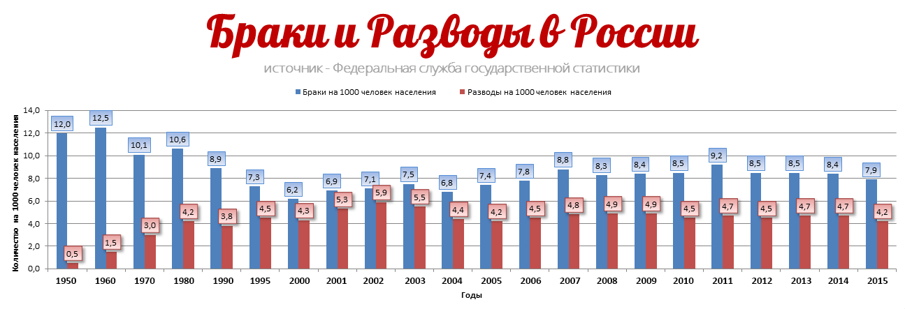 Как сообщает Росстат, количество браков в России в прошлом году в России было 923 000 (или 6,4 брака на 1000 населения). Ну и параллельно с вступлением в брак, как это ни странно, но и разводятся. А количество разводов в прошлом году было 644 000 (или 4,4 на 1000 населения).