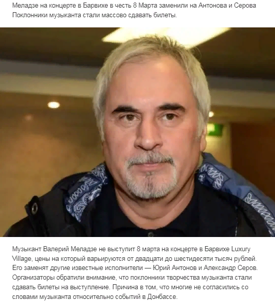 Нечто подобное произошло и с Валерием Меладзе. Его на концерте в честь 8 марта пришлось быстро поменять на Юрия Антонова.