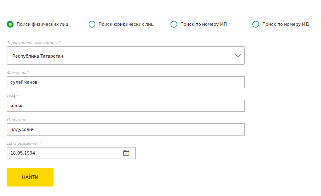 Заполнение паспортных данных на сайте Федеральной службы судебных приставов