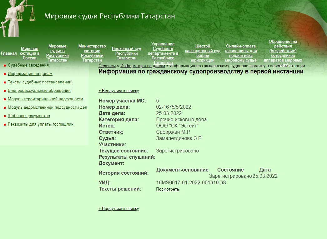 Я думаю никак, У нас на сайте мировых судей в Татарстане вообще нет никакой информации.