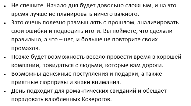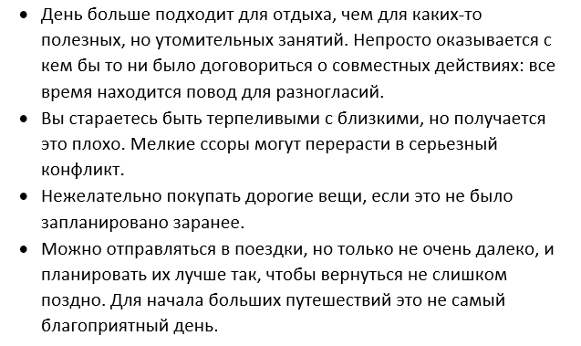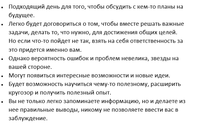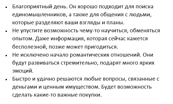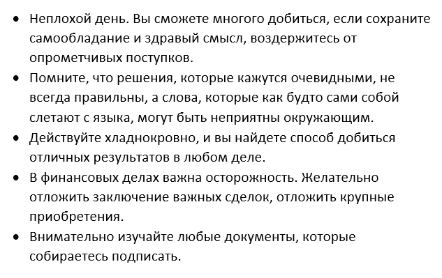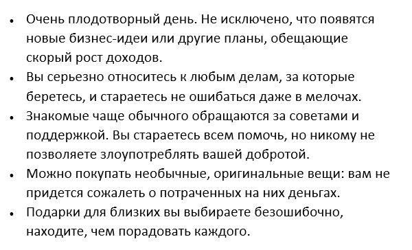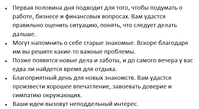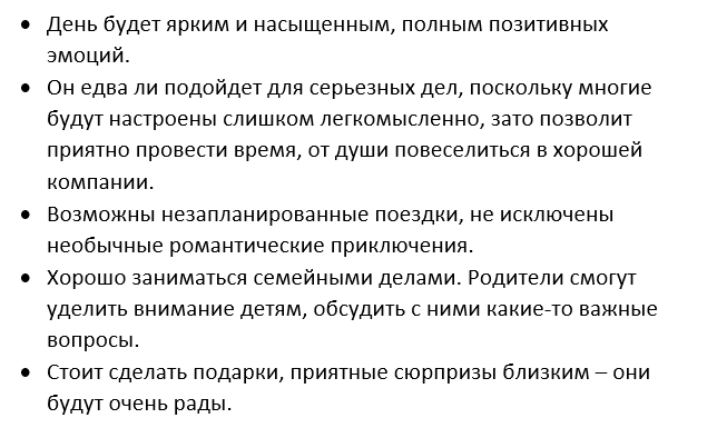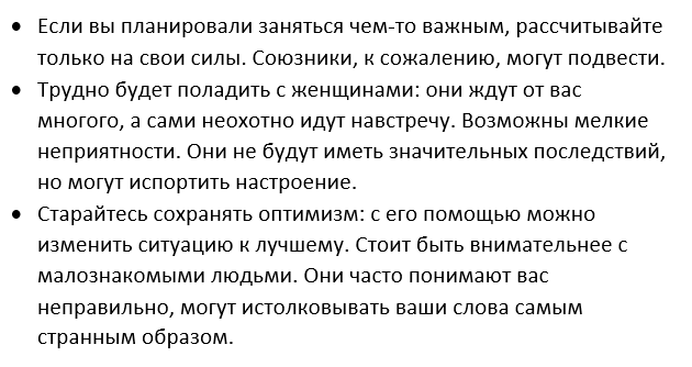 Фортуна будет на вашей стороне, и даже не захочется делиться полученными ресурсами. Не подходит день для выяснения отношений. Вас будет «тянуть» в размышления и самоанализ. И вы не будете настроены на общение.