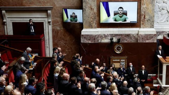 Зеленский, появление французские парламентарии встретили аплодисментами, призвал французские компании Рено, Леруа Мерлен и Ашан покинуть Росси, в корой указанные компании осуществляют свою деятельность.