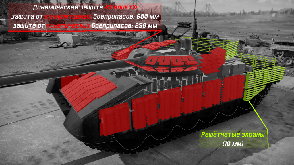 -Вооружение 125-мм гладкоствольная пушка 2 А 46 М-4 с автоматом заряжания которая обеспечивает 6-8 выстрелов в минуту, с бронебойными снарядами (ОБПС)