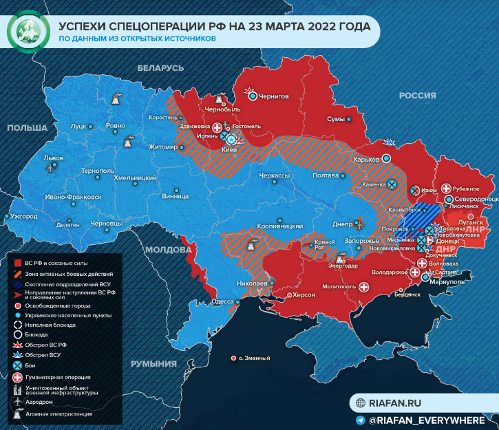 Вчера 23 марта закончился 28-й день специальной операции России на Украине по демилитаризации и денацификации страны. Некоторые люди рассчитывали, что спецоперация закончится быстро капитуляцией политического режима Украины. Военная наука и практика внесли свои коррективы. За 8 лет необъявленной войны против Донбасса ВСУ Украины были модернизированы, около 600 тысяч украинцев прошли практическую школу военного обучения в зоне военных действий против Донбасса, само население «переформатировано» на антироссийских позициях. Итоги 28 дней спецоперации на графике из открытых источников.