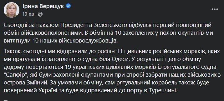 Об этом сообщила вице-премьер Украины Ирина Верещук. По её словам, 10 российских военнослужащих обменяли на 10 пленных украинцев.