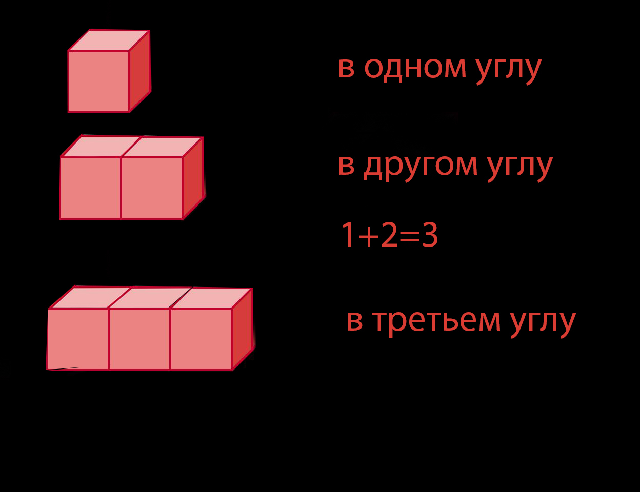 Сколько кубиков должно лежать в каждом из 2 углов, если известно, что если их собрать вместе , то можно из их суммы выложить такую же конструкцию в третьем угле?