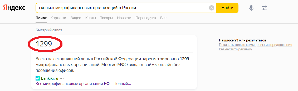 Скриншот результата поиска по запросу «сколько микрофинансовых организаций в России» из поисковой системы «Яндекс» на 27.03.2022