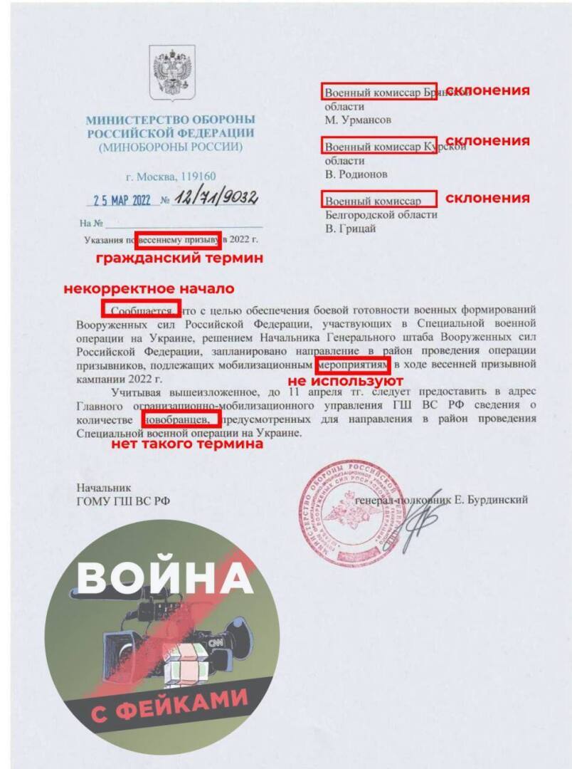 Призыв в армию и мобилизационные мероприятия — это разные понятия, а в документе написано, что это одно и тоже. Кроме того, в России есть термины "мобилизационная подготовка" и "мобилизация", а мероприятий — НЕТ. Что значит мероприятие по мнению этих тупоголовых создателей фейков? "Сегодня, такого-то числа сего года, всем НОВОБРАНЦАМ, явиться на площадь М, чтобы принять участие в мероприятии, под названием военная операция. Всем будут раздавать печеньки и кофе бесплатно, а так же, вечером будут музыка и танцы"!? Армия РФ на столько ска слаба, что не может обойтись без НОВОБРАНЦЕВ!? Вы это серьёзно!? Кто-то считает, что брать новобранцев в армию, для решения важных задач, для управления супертехнологическим военным оборудованием, самолётами, танками, ракетами, это лучшее, что может придумать российское командование в 21 веке!?