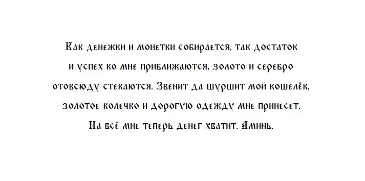Заговор на достаток проводится с новым кошельком, в которой нужно положить несколько новых купюр разного номинала. Желательно положить в кошелёк и несколько новых блестящих монет. На открытый новый кошелёк, наполненный так, как мы написали, нужно прочитать следующий текст: