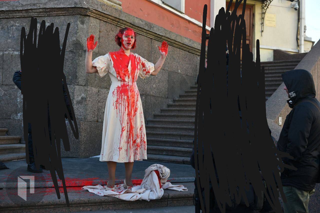 Петербурге женщина облила себя красноватой краской у строения городской мысли, ее притормозили.
