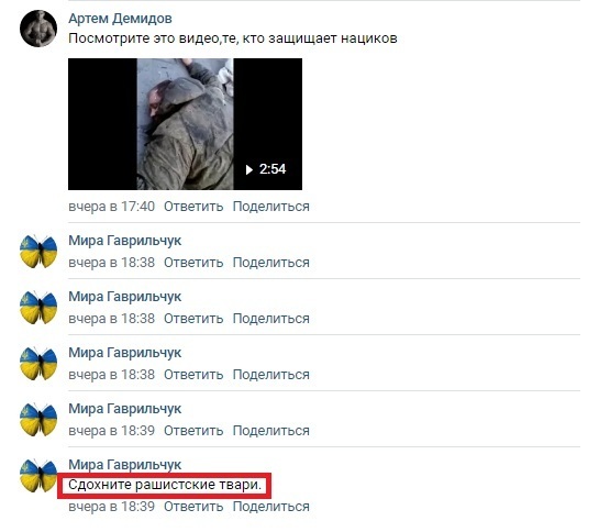 Все смотрели ролик, как ВСУшники стреляют по ногам пленным российским бойцам? Тот тупень, который выложил это видео, не понимает, что это видео пойдет как свидетельство преступлений киевского режима, а те люди, которые это делали, если их не зачистят во время боев, пойдут под международный суд как военные преступники. И Россия обязана всеми способами довести ублюдков и нежить до суда и виселицы за преступление против человечности. И те, кто радуется этим преступлениям, те, кто разжигает ненависть, тоже должны получить свое. Такие, например, как эта Мира:
