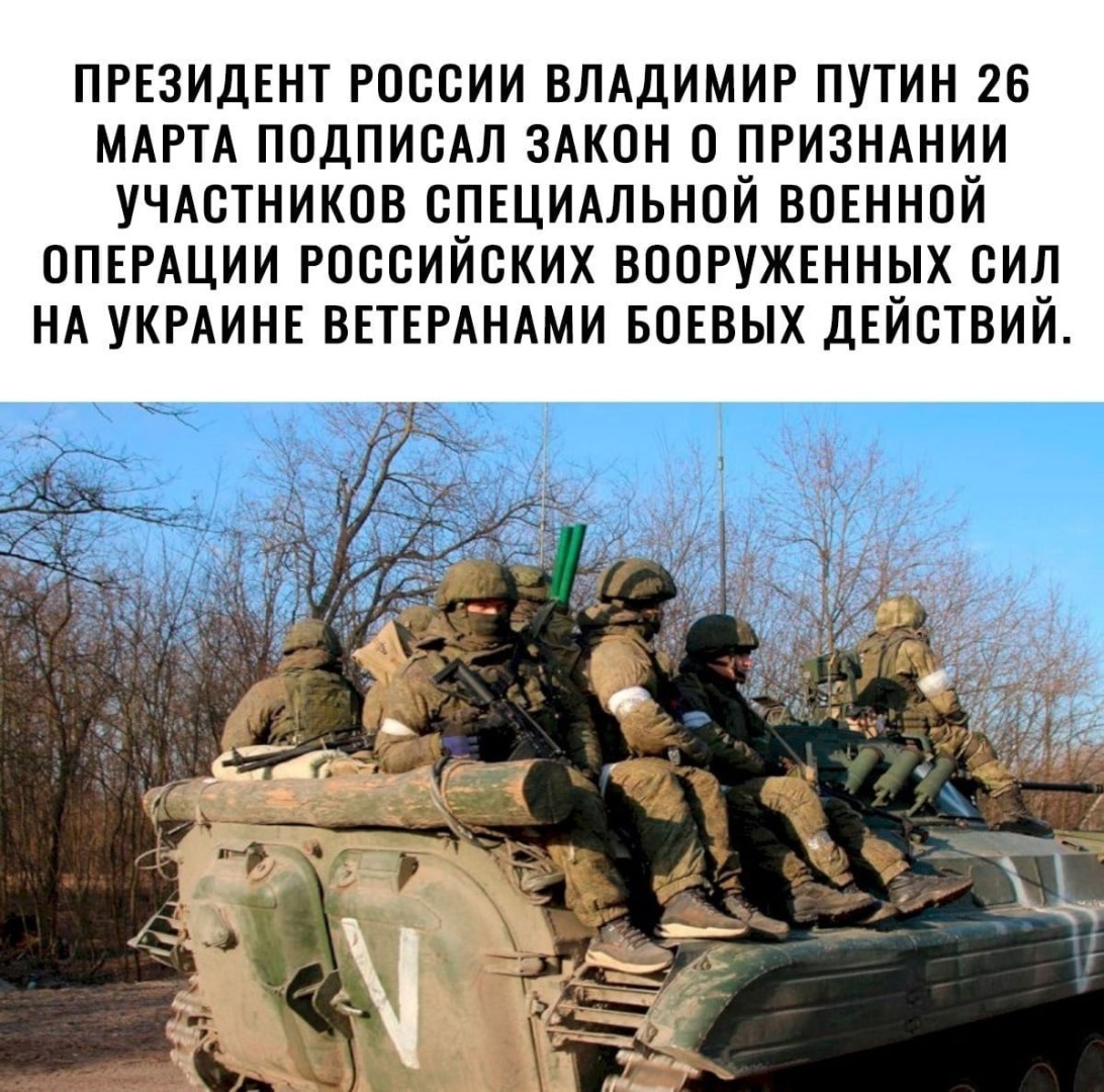 ПРЕЗИДЕНТ РОССИЙСКОЙ ФЕДЕРАЦИИ ВЛАДИМИР ВЛАДИМИРОВИЧ ПУТИН 26 МАРТА ПОДПИСАЛ ЗАКОН О ПРИЗНАНИИ УЧАСТНИКОВ СПЕЦИАЛЬНОЙ ВОЕННОЙ ОПЕРАЦИИ РОССИЙСКИХ ВООРУЖЕННЫХ СИЛ НА УКРАИНЕ ВЕТЕРАНАМИ БОЕВЫХ ДЕЙСТВИЙ.