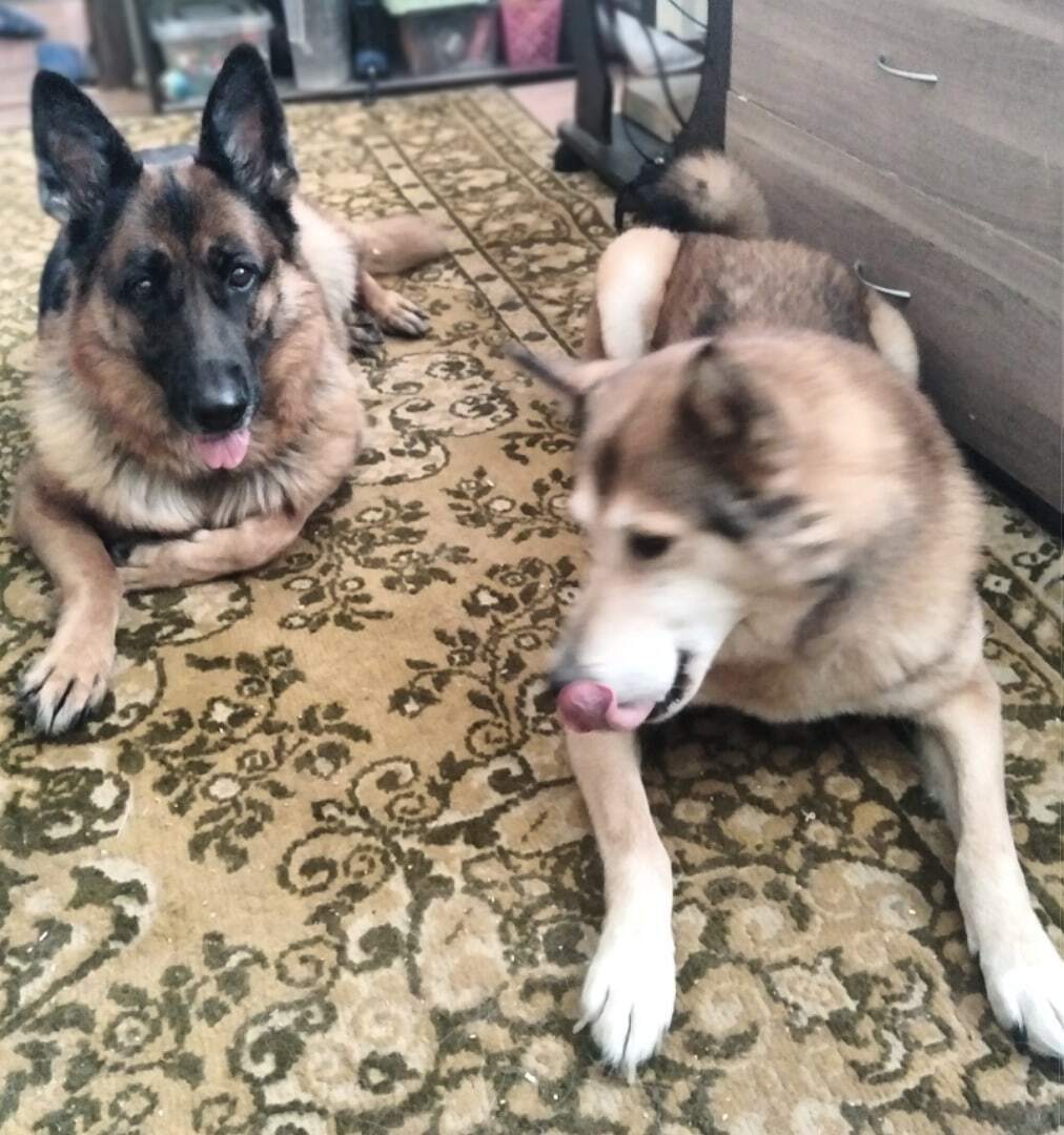 Это немецкая овчарка Пума и ЗСЛ (Западно Сибирская Лайка.) Рыжик. Мои лохматые доктора от скуки и хандры. Моя защита и опора. Пума - моя"родная" собака, а вот Рыжик подобран на улице. Появился он в нашем районе неожиданно, был грязный и худой, но людям доверял, даже не подозревал, что человек может ударить. За год бездомной жизни много лиха нахлебался, понял, что не все люди хорошие, что вскинутая вверх рука не погладит, а ударит. Он уже старый и больной, видит и слышит плохо, к тому же у него эпилепсия. За год бродяжничества не раз попадал под машины, к счастью без серьёзных увечий. Весь этот год он жил возле нашего дома. Пёс который не лает, не гадит, ни кого не трогает, мешал многим соседям. Чем мешал? А, просто своим существованием. Весь год я его кормила, лечила, пускала в подъезд, сделала будку, а в конце лета забрала домой, понимая, что ещё одну зиму он не переживёт на улице. И не сколько не пожалела, жалею только об одном, что не взяла его раньше.