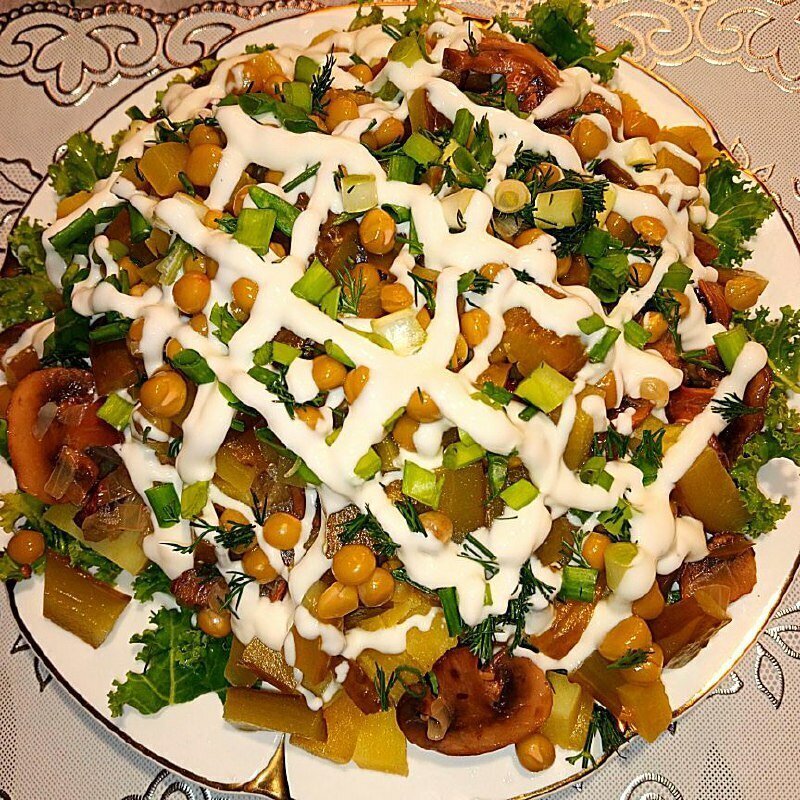 На второй слой пойдёт сваренная и порезанная крупным кубиком картоха. На нее (это уже третий слой?) — обжаренные с луком грибы. Их предварительно нужно порезать (как я люблю) тонкими пластинками.